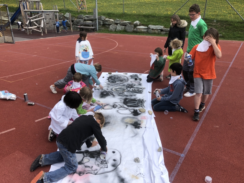 Wir haben ein Huhn, Fanas und Schule Fanas gesprayt es wurden alle sehr cool. Ich war beim Huhn. Am Mittwoch kam ein Sprayer aus Grüsch zur Hilfe, der uns die richtige Technik zeigte. Die Bilder hingen wir auf, für jedes Stockwerk eins. Am Donnerstag mussten wir beim Chillecken helfen und den Bericht für den Freitag, wenn die Eltern kommen üben.